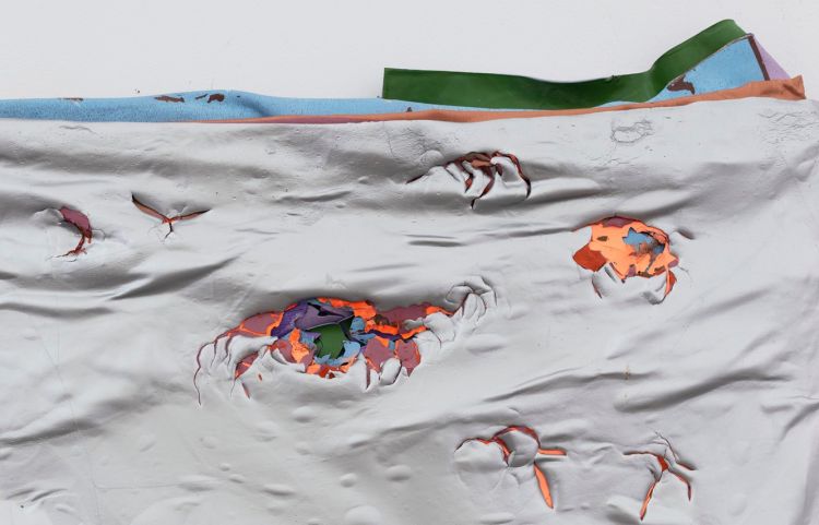 Winter is Coming is the most recent series that Ju Ting has been experimenting with since last winter in Beijing. Living in the harsh winter climate of Northern China, Ju Ting started reflecting: What if I left the layers of acrylic paint completely hardening in the cold and dry weather? What action could I take without much manipulation of the material? The actual answer shown on the surface are holes caused by a hammer, through which cracked layers of color are revealed.