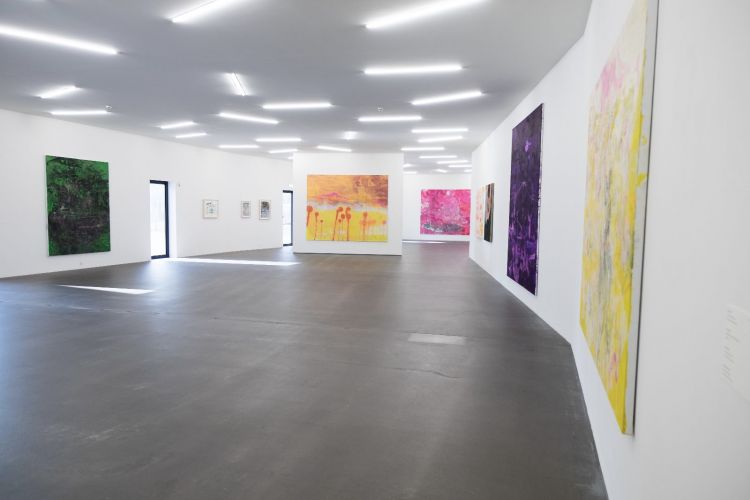 Non-native species: soapbubbles and cacti is blanketed in a localised downpour, while Mauvaise Herbe glows as if under searing sun. Both are landscapes populated and dominated by an eclectic array of flora, with a distant settlement outlined in the latter. Baobab trees in a shorthand outline dot the canvases, their dimensions out of synch: in mauvaise herbe they tower over hills, as they do in soapbubbles, while sprouting up in the foreground too. mauvaise herbe – weeds – triggers a distant memory, of Antoine de Sainte-Exupéry’s Little Prince uprooting the baobab trees that, left to their own devices, would smother his diminutive planet.[2] The works share another plant form, a dot on a stalk: closer to balloons in soapbubbles, maybe a soaring LA palm tree in the other. Or are we under water? Are those balloons buoys straining upwards, are the outlines not trees but coral, bleached because colourful marine algae cannot survive as sea temperatures rise? Though one exudes searing heat and the other liquid movement, in both volatility reigns. Don’t look for a natural habitat; these are composite environments. Environments marked by contemporary realities of migration, transformation and extinction.
