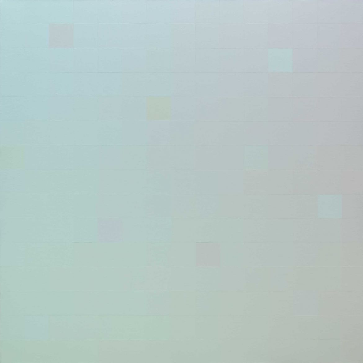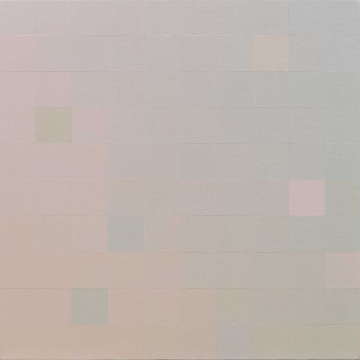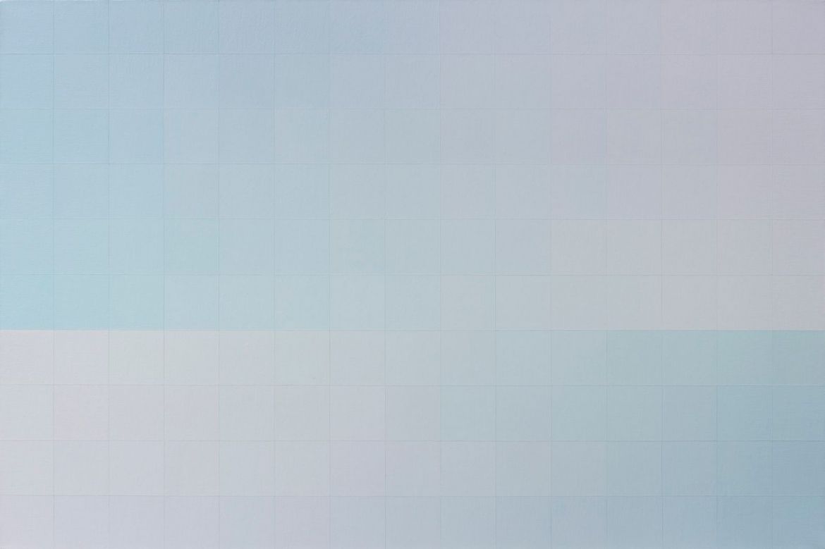 Imagine Zhang Xuerui's paintings as building facades, with equal squares dividing the entire canvas. These squares are parallel to the frame, positing a geometric certainty. The dynamic of the painting comes from its colors—in most cases, each square of color is linked to its neighbor by an almost imperceptible color gradient, making the overall rhythm appear soft and unhurried. The interval shifts in color achieve spatial depth in the picture, but the story within each window is concealed, like flickering lights of varying tone faintly shining through the curtains, while we can never know exactly what is unfolding behind the curtains. They tell a story through non-representational methods, or more precisely, they correspond to a stream-of-consciousness monologue.