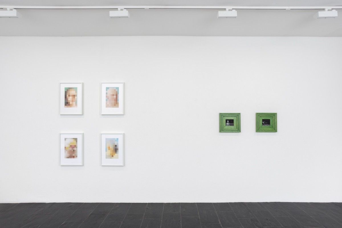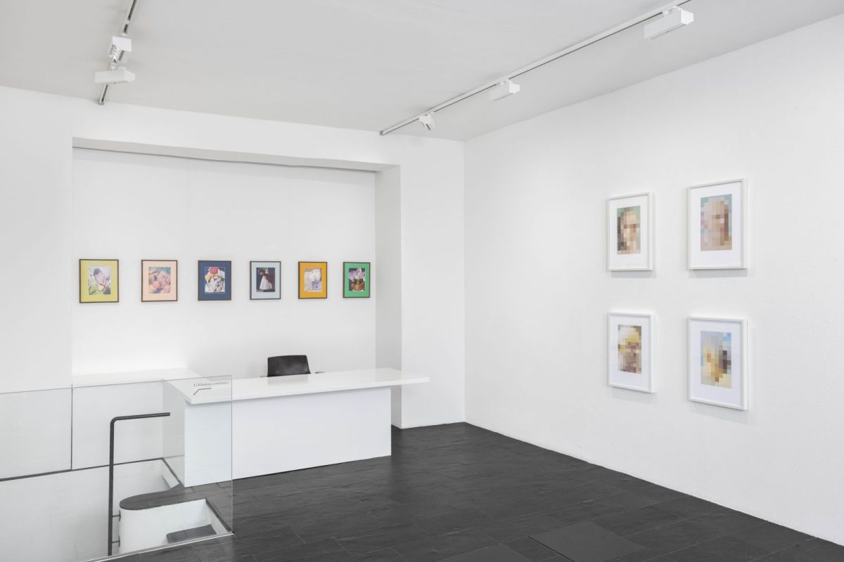 Urs Lüthi’s (1947, Kriens, Switzerland) pixelated self-portrait prints Lontano Il Reale Tempo Umano (2023), reveal a “hidden” self through delicate, pale-toned squares arranged like the pixels of a deliberately obscured image. Developed from digital photographs of himself - manipulated on the computer prior to printing - the works present a deconstructed version of the artist. In Klodin Erb’s (1963, Winterthur, Switzerland) collage series Essen, Sex und Kleider (2021-2022), bodies and faces appear fractured and reassembled, evoking the fragile reconstruction of identity. Lüthi’s practice often explores the boundaries of selfhood and the performative aspects of identity, working across a range of media - including painting, sculpture, and photography - to probe the ways we present, and conceal, ourselves. Similarly, Erb’s collages deconstruct everyday imagery to question social norms, desire, and the fluidity of personal and collective identities, revealing how meaning is constantly negotiated through visual fragments.