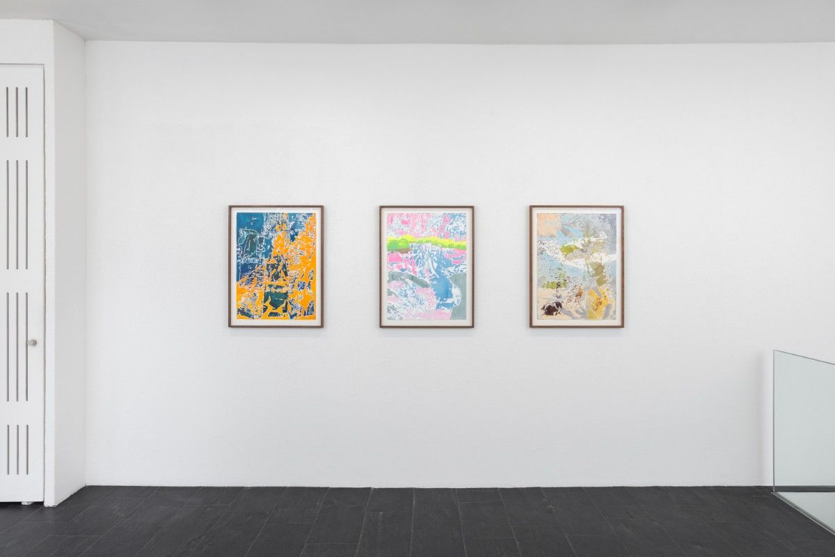 Visitors are initially welcomed by a rainbow of colors: Rebekka Steiger’s (1993, Zurich, Switzerland) abstract paintings Untitled (2023) radiate with chromatic intensity. Steiger’s compositions, developed through an experimental printing process initiated in Vietnam, use thin traditional handmade local paper to transfer paint onto Büttenpapier or canvas, producing unpredictable, textured imprints. Marking a shift from her predominantly figurative practice, these works move into landscape abstraction, where traces of process evoke memory, color, and atmosphere.