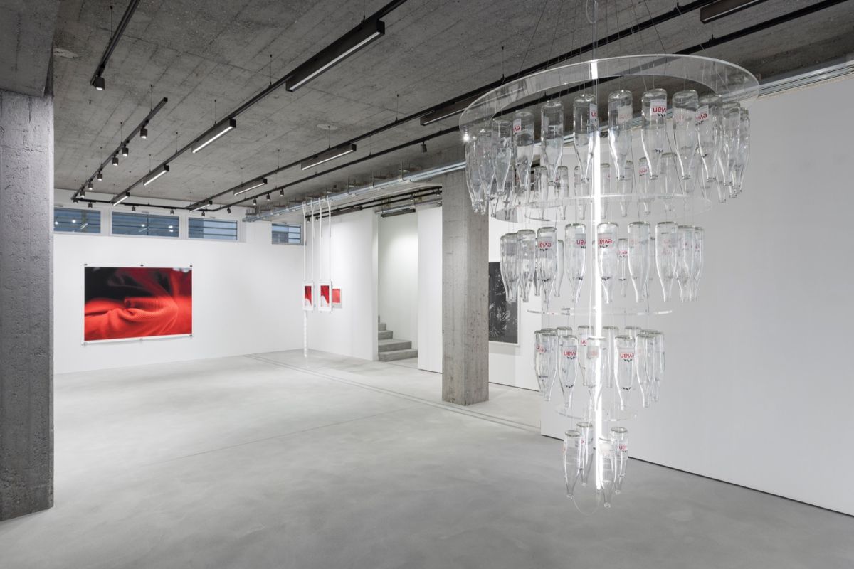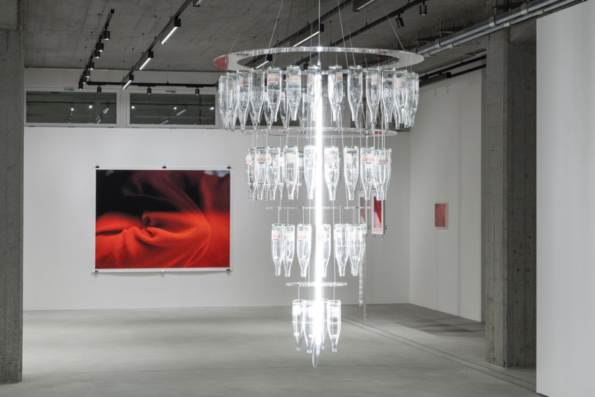 RD: The central work in the exhibition is Anti-Conformist Conformist Chandelier (Evian) (2025), a chandelier made from seventy Evian glass bottles.