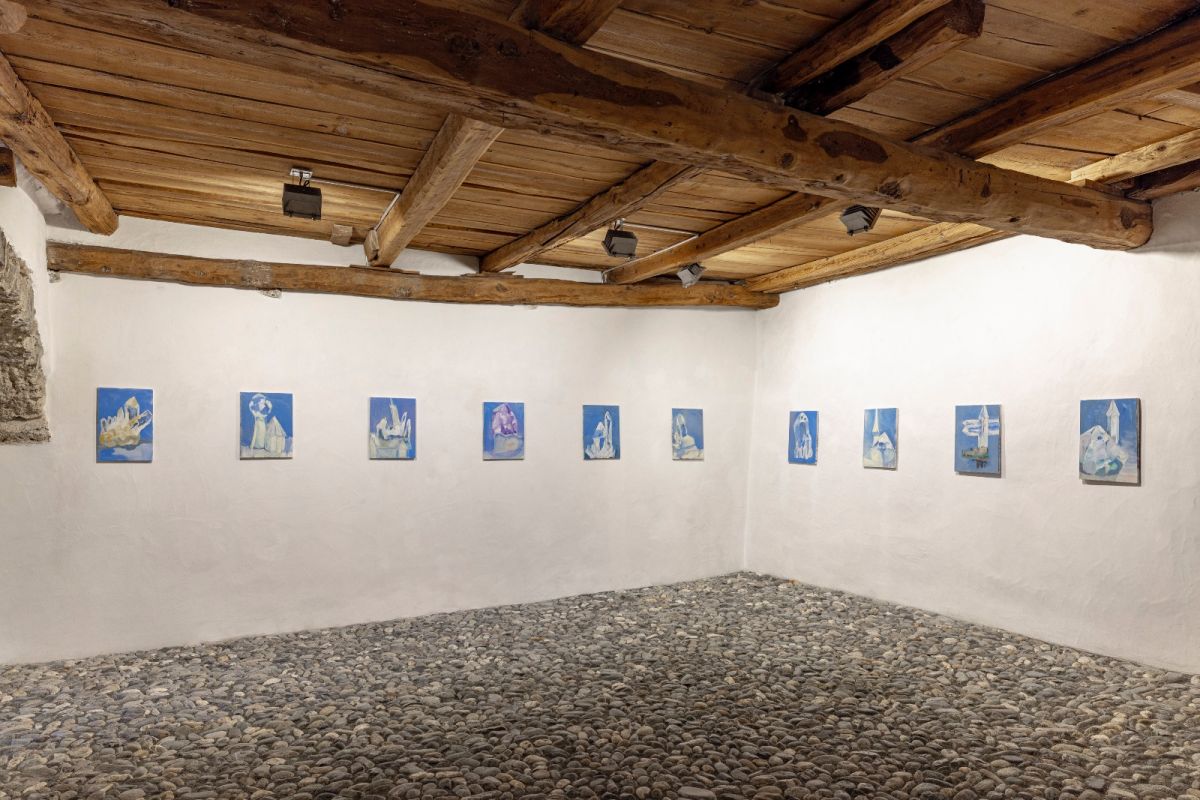Some works feel like they have thickened in the cold. Klodin Erb’s Raketen paintings resemble icy icons, hybrids of church and crystal. Each one is named after a real rocket, as if they’re holding their breath before lift-off, lending a muted sense of propulsion to otherwise static images. Erb’s Nachtisch, on the other hand, sets a tone of festive excess. Hybrid figures emerge as overripe offerings: part fruit, part flesh, part ornament. Pleasure and decay settle together, like a party table after the guests leave: crumpled napkins, something sweet still in the air. Alice Wang’s works zoom in, they’re microscopic and cosmic at the same time. Her meteorite scans are silvery, splintered, like ice trying not to break. Lêna Bùi’s paintings flicker between botanical and anatomical. They feel steeped in the seasonal pace: slowed, alert, held close.Like winter itself, they ask for proximity and reward attention over time. Miao Miao’s trees are calm and brittle. Behind them, windows and walls, flattened city textures. They rest in a suspended pause, a kind of compression of memory and time. Rebekka Steiger’s painting conjures a nocturnal scene: two spectral riders moving through a thick blue sky. The scene evokes a deep winter night. The palette is glacial, but pulsing: washes of color flicker and layered pigments settle like cloud cover or cosmic dust.