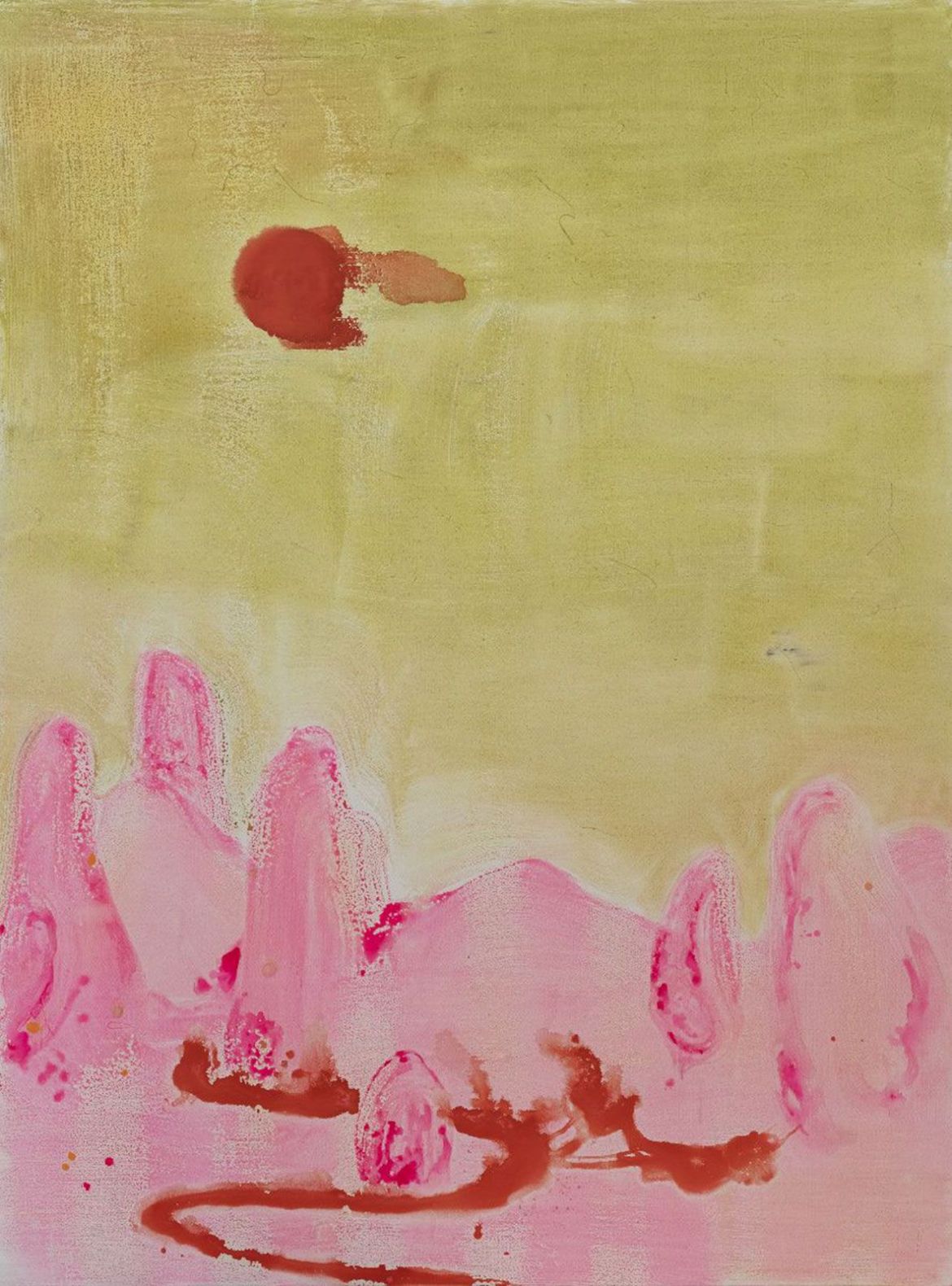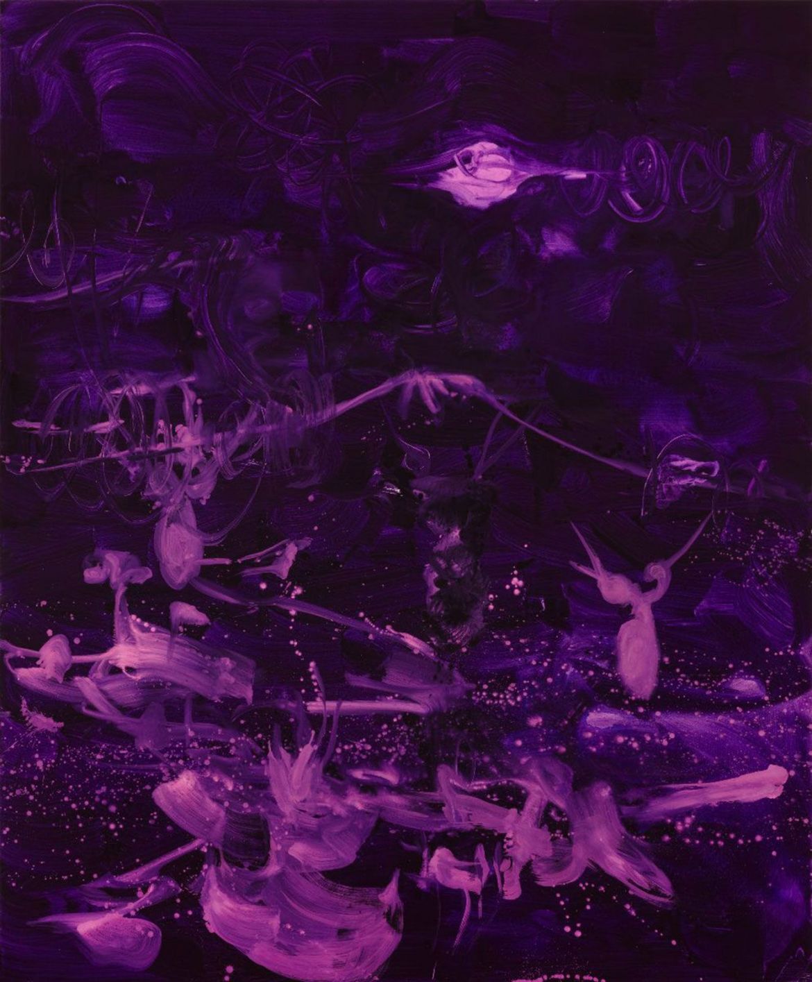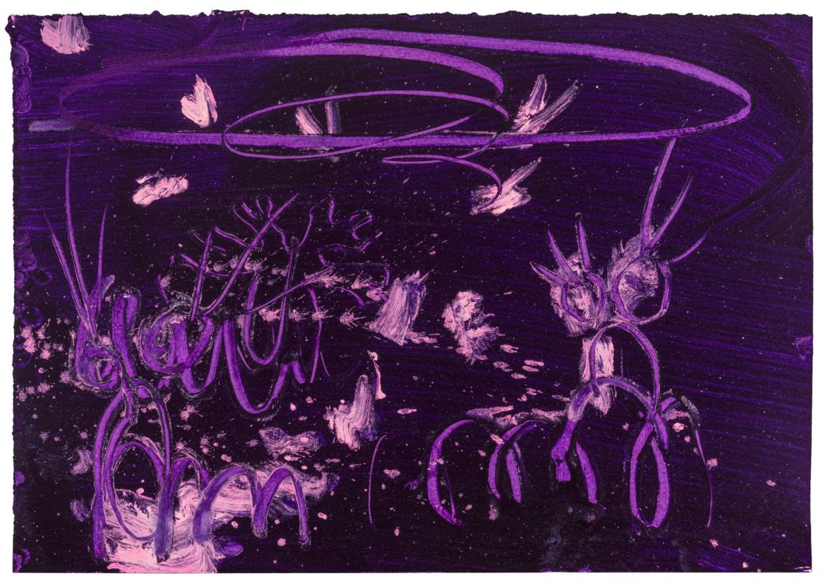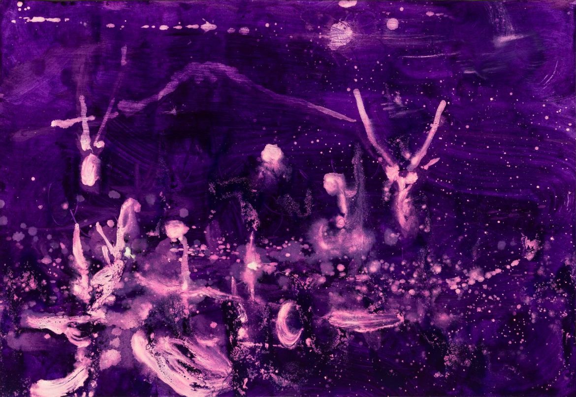 Yet true to life. My neighbour’s garden spills over into ours. Among the foliage is what I believe is Callicarpa, sometimes called beautyberry, or Schönfrucht in German. Beauty is in the eye of the beholder – though it occurs naturally, it is native to Asia, I find the glaring purple an aberration within a botanical palette. For me it belongs instead in the register of science, in the laboratory, say, where contrast is a tool for identification and, with luck, diagnosis. Steiger’s dead wake is a similar purple. The mountain and sun she outlines notwithstanding, the colour is close to that of the disclosing tablets we chewed on as children to reveal (we gorily hoped) plaque on our teeth. Emphasised further by the fact that Steiger’s image is in negative, brushstrokes and paint splatters glowing white as if they were an immunofluorescent reaction in purple darkness. In accord once more with Yeats, Steiger’s colour could be natural but seems artificial.