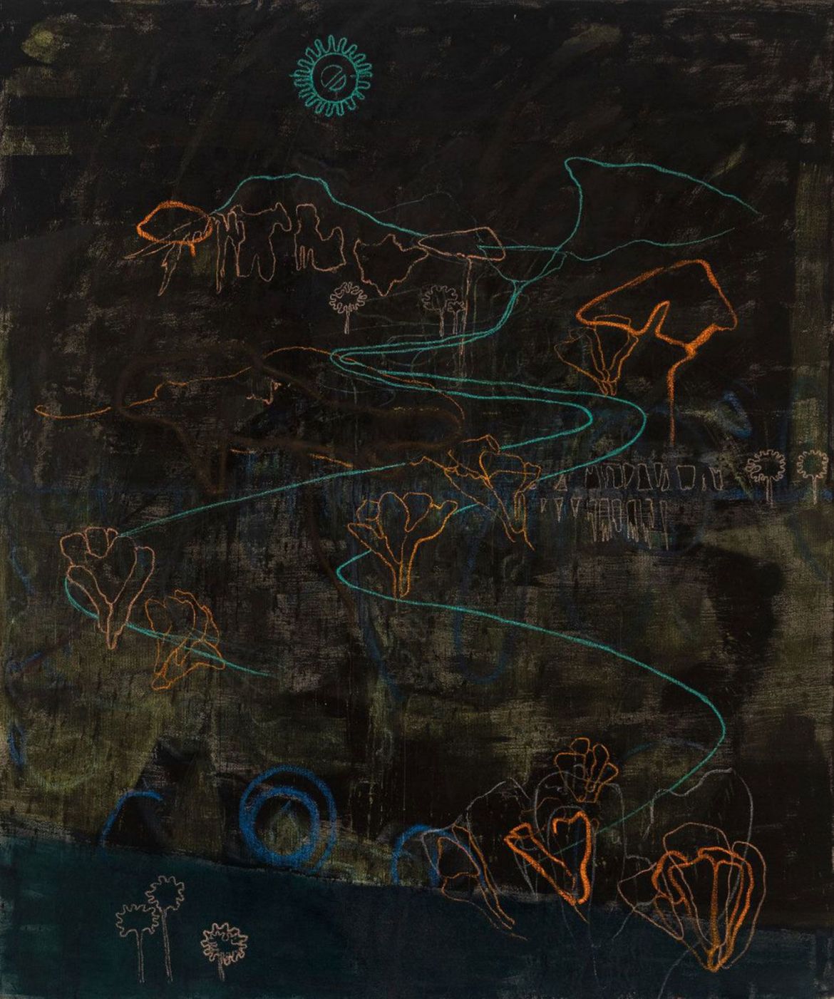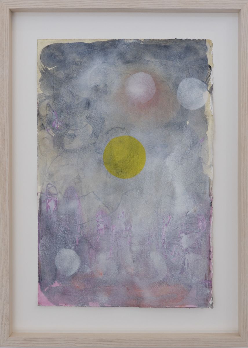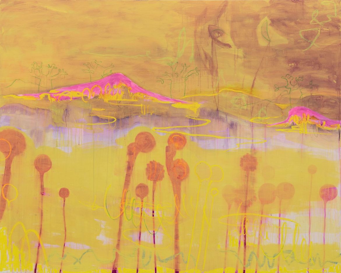 Non-native species: soapbubbles and cacti is blanketed in a localised downpour, while Mauvaise Herbe glows as if under searing sun. Both are landscapes populated and dominated by an eclectic array of flora, with a distant settlement outlined in the latter. Baobab trees in a shorthand outline dot the canvases, their dimensions out of synch: in mauvaise herbe they tower over hills, as they do in soapbubbles, while sprouting up in the foreground too. mauvaise herbe – weeds – triggers a distant memory, of Antoine de Sainte-Exupéry’s Little Prince uprooting the baobab trees that, left to their own devices, would smother his diminutive planet.[2] The works share another plant form, a dot on a stalk: closer to balloons in soapbubbles, maybe a soaring LA palm tree in the other. Or are we under water? Are those balloons buoys straining upwards, are the outlines not trees but coral, bleached because colourful marine algae cannot survive as sea temperatures rise? Though one exudes searing heat and the other liquid movement, in both volatility reigns. Don’t look for a natural habitat; these are composite environments. Environments marked by contemporary realities of migration, transformation and extinction.