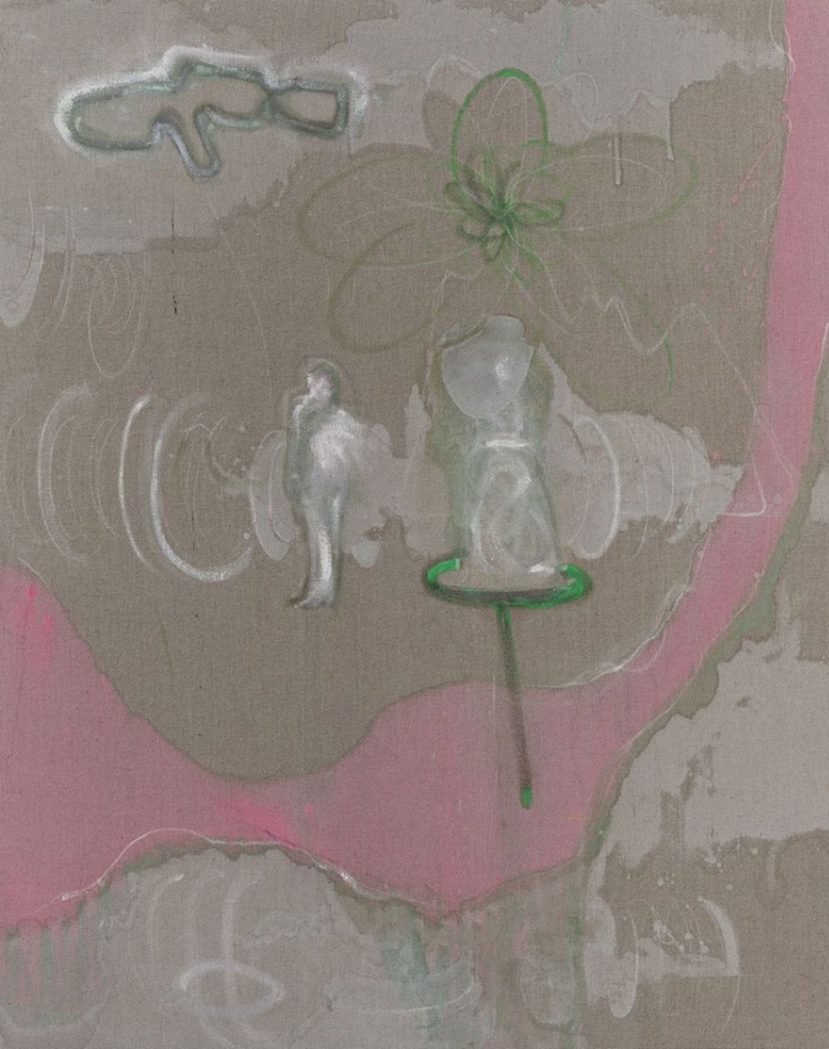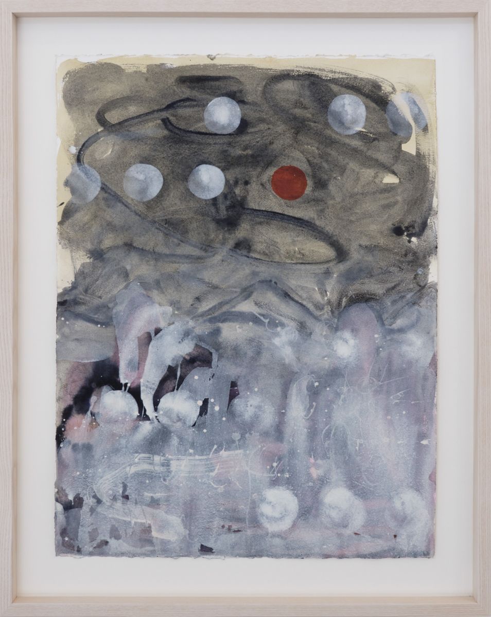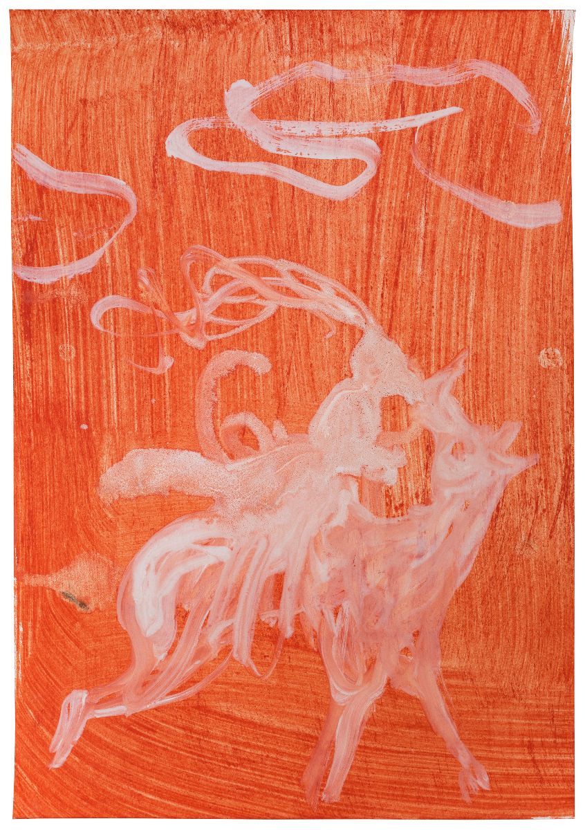 Non-native species: soapbubbles and cacti is blanketed in a localised downpour, while Mauvaise Herbe glows as if under searing sun. Both are landscapes populated and dominated by an eclectic array of flora, with a distant settlement outlined in the latter. Baobab trees in a shorthand outline dot the canvases, their dimensions out of synch: in mauvaise herbe they tower over hills, as they do in soapbubbles, while sprouting up in the foreground too. mauvaise herbe – weeds – triggers a distant memory, of Antoine de Sainte-Exupéry’s Little Prince uprooting the baobab trees that, left to their own devices, would smother his diminutive planet.[2] The works share another plant form, a dot on a stalk: closer to balloons in soapbubbles, maybe a soaring LA palm tree in the other. Or are we under water? Are those balloons buoys straining upwards, are the outlines not trees but coral, bleached because colourful marine algae cannot survive as sea temperatures rise? Though one exudes searing heat and the other liquid movement, in both volatility reigns. Don’t look for a natural habitat; these are composite environments. Environments marked by contemporary realities of migration, transformation and extinction.