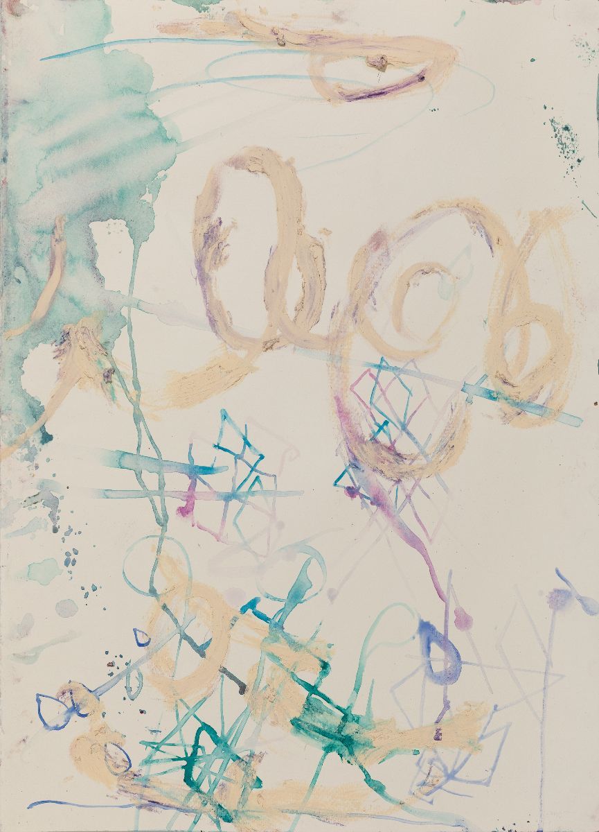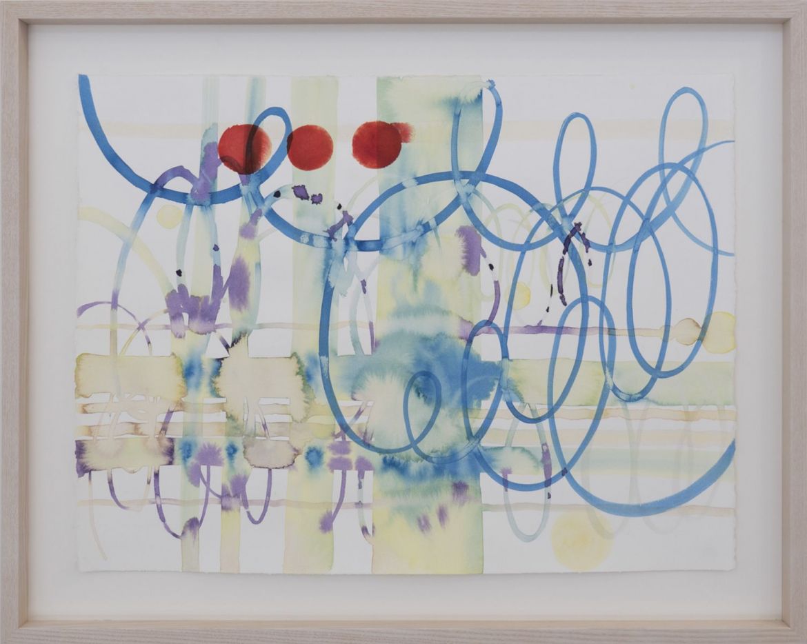 Colour changes in relation to molecules in the atmosphere and the scattering of light; scenes as they curve over the horizon are in lower contrast[1]. While landscape is an important form within Rebekka Steiger’s recent works, her constituent elements do not adhere to the globe; they hover or float, untethered. The horizon is as crisp as the foreground. The white surface of an untitled work from 2019 (as are all works referred to here) is dotted with a granular texture of pink lozenges, the landscape then painted on top in further white, looping outlines. A snow-capped mountain and a tree are more or less the same form, one an inversion of the other. Elongated, they become perhaps liquid, perhaps wind-blown flora. At first boxing the compass seems anchored, featuring a meandering seam of turquoise flowing down from distant mountains towards us, broadening as it comes closer. Yet the crisply outlined shrubs or trees that dot the roadside don’t adhere to the perspectival narrative, happenstance dictates whether they are towering or diminutive. There are ideas of distance and of proximity, weight and lightness in play, but they are paradoxical.