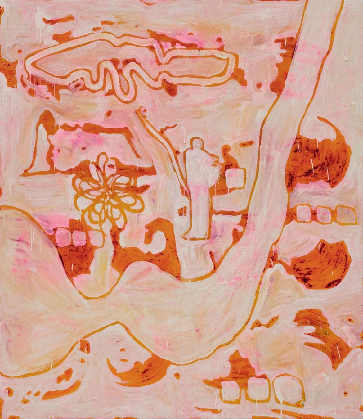 Instead of a whale I see a tuber. A rhizome, to borrow Deleuze and Guattari’s terminology in 1980’s A Thousand Plateaus. To read the shape this way means ignoring the scale of all other figures around – imagine these are roots in close-up, the kind of roots that are inspiring in their underground, unseen vitality, their unfettered drive to extend and colonise new soil. I don’t know if Deleuze and Guattari, philosopher and psychoanalyst respectively, are concerned with this immodest hunger to extend; their interest lies in decentred structures. And, aptly, they are thoroughly modest, declining at the outset the singular prophet’s role: ‘We are no longer ourselves. […] We have been aided, inspired, multiplied.’[4]