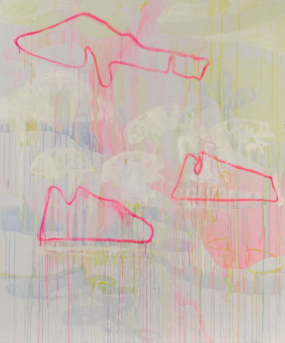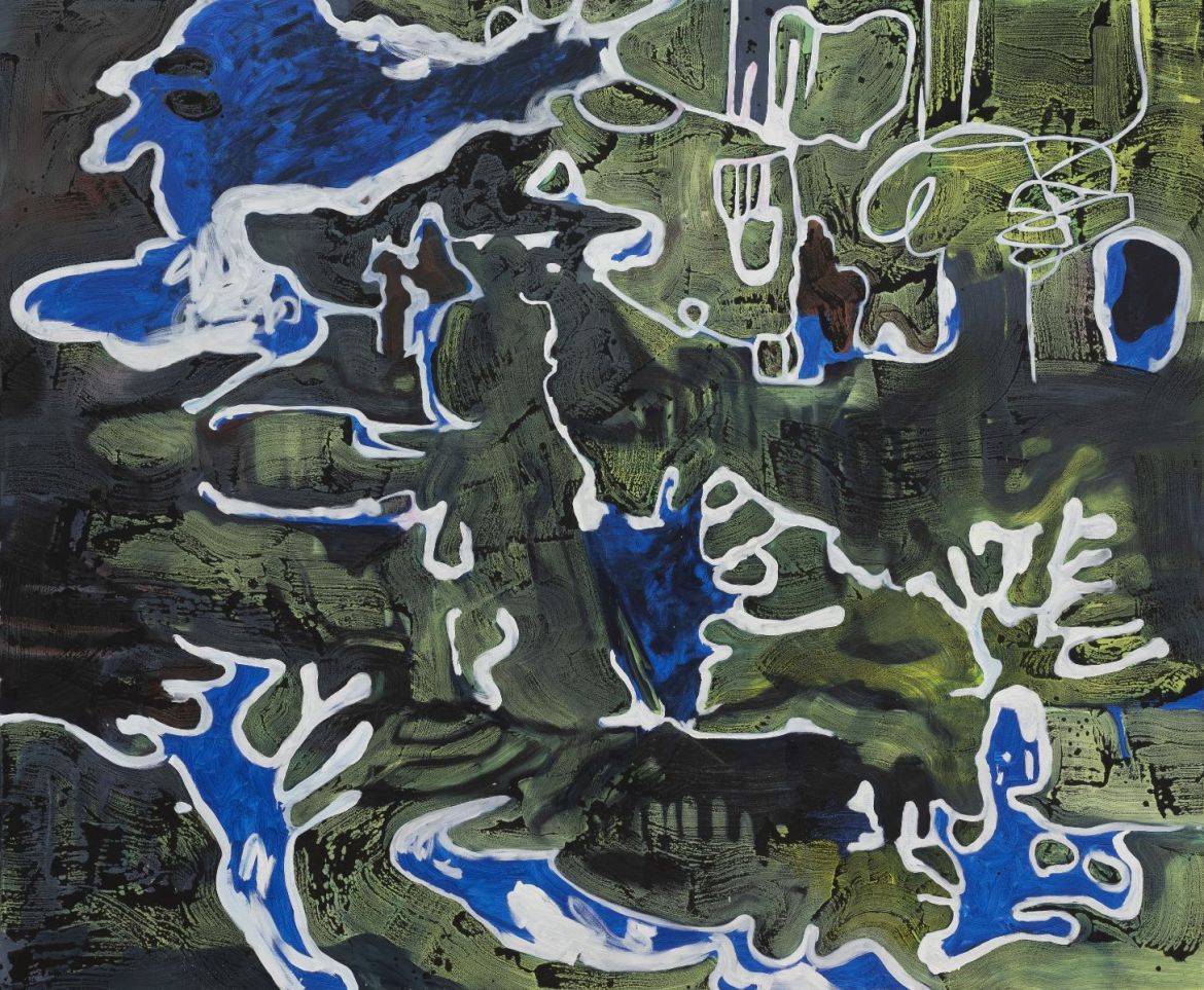 The whale. A whale is how the artist describes the large form travelling from the top of the canvas to the left-hand side, with bladder-like bulges in works such as bar pilot. It too seems discrete from the surrounding elements, typically so for Steiger’s ingredients, yet nonetheless surprisingly. If it is a whale it must be deep under water, its movements in the depths unfathomable. Of that most famous of fictional whales, Herman Melville writes ‘One of the wild suggestings referred to […] was the unearthly conceit that Moby-Dick was ubiquitous; that he had actually been encountered in opposite latitudes at one and the same instant of time’[3]. The behemoths we know best today are omnipresent and intangible: governments, they in turn overshadowed by the might of global corporations, networks utterly ensnaring us and data we generate in inexpressibly large quantities.