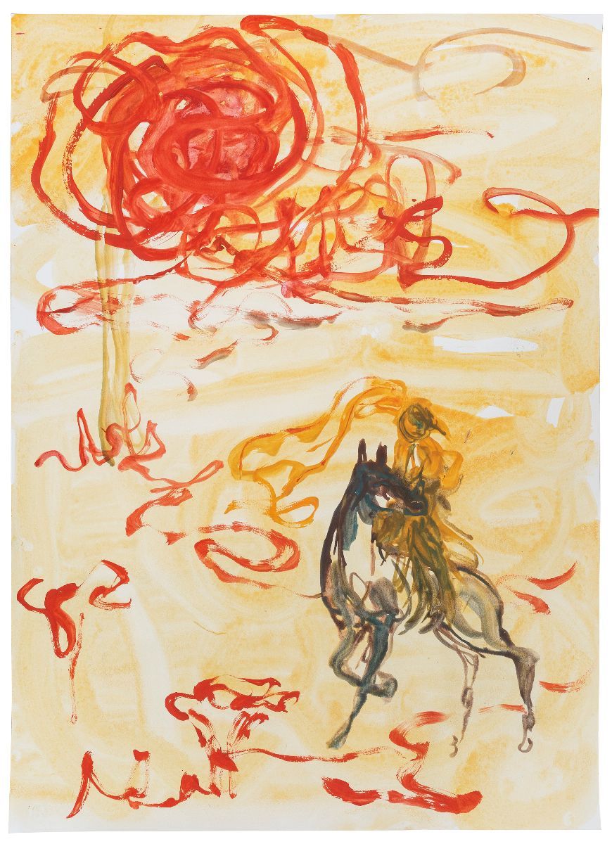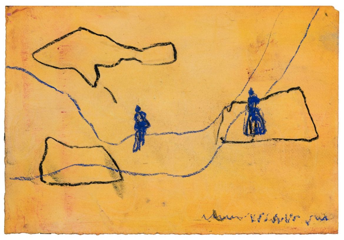 The cast of figures develops gradually. A Mongolian horseman and rider at full tilt, a full-skirted woman and bird-headed figures have been in Steiger’s ensemble for several years; now there are a barfly and scorpions too. I’m reminded of Jack B. Yeats’ latter, breathtakingly expressive works, such as Leaving the Far Point from 1946, in which writhing brushstrokes entangle his figures in their landscapes. Steiger and Yeats’ figures share an upright poise, so they maintain a degree of autonomy even as they merge with their surroundings. In The Sea and the Lighthouse, 1947, the grieving Yeats observes the coast at night, the sky an electric blue that prefigures International Klein Blue by a decade. Yeats’ landscapes are specific, off Sligo on Ireland’s Atlantic west coast in these two examples, yet in his latter works the setting is just as much a psychological as a physical landscape.